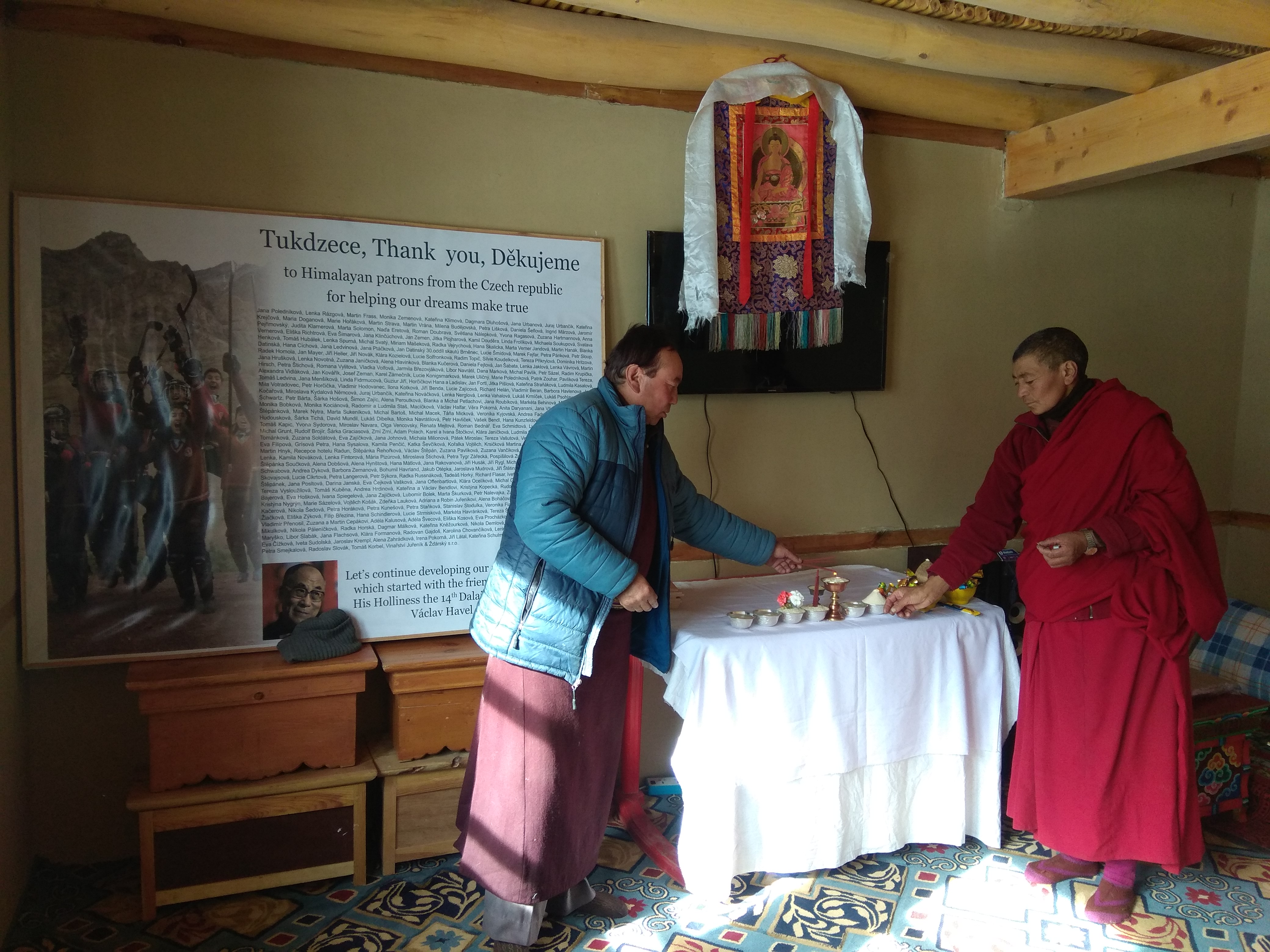 Protože víme, že Vánoce jsou jedním z vašich nejvýznamnějších náboženských svátků, máme ve zvyku modlit se společně s vámi. Každý rok děláme buddhistickou mši, které říkáme po našem pudža. V průběhu pudži se modlíme za šťastný a pokojný život Himálajských patronů. Abychom si připomněli jména všech patronů tiskneme je na jeden velký plakát.